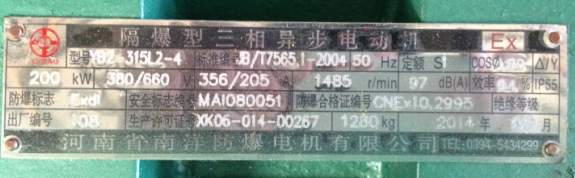 今天上午有個(gè)客戶打來電話詢問是否有YB2系列4P200KW防爆電機(jī)的現(xiàn)貨,我說有的。然后我就把YB2系列4P200KW防爆電機(jī)的銘牌給客戶發(fā)過去了。然后客戶需要回去商量一下,下面為大家列出YB2系列4P200KW防爆電機(jī)的銘牌。如果大家有需要購(gòu)買YB2系列防爆電機(jī),可以和我們河南省南洋防爆電機(jī)生產(chǎn)廠家聯(lián)系,我們會(huì)為您竭誠(chéng)服務(wù)的。